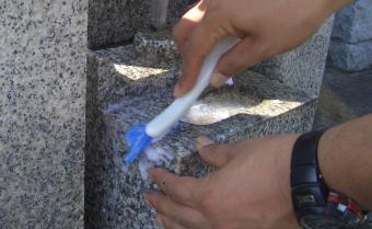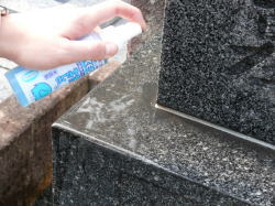 洗浄剤をお墓に塗布します軽く水洗いした後、特殊洗浄剤をお墓に塗布し、一定時間おき、汚れが浮き出るのを待ちます。人体にも優しい洗浄剤を用いて、作業は素手で行います。 |